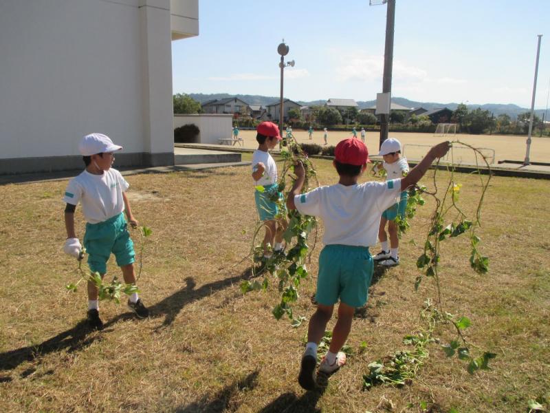 掘った後は、さつまいものつるや葉で遊びました。