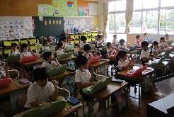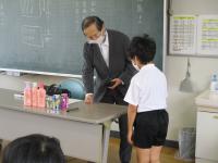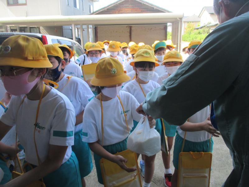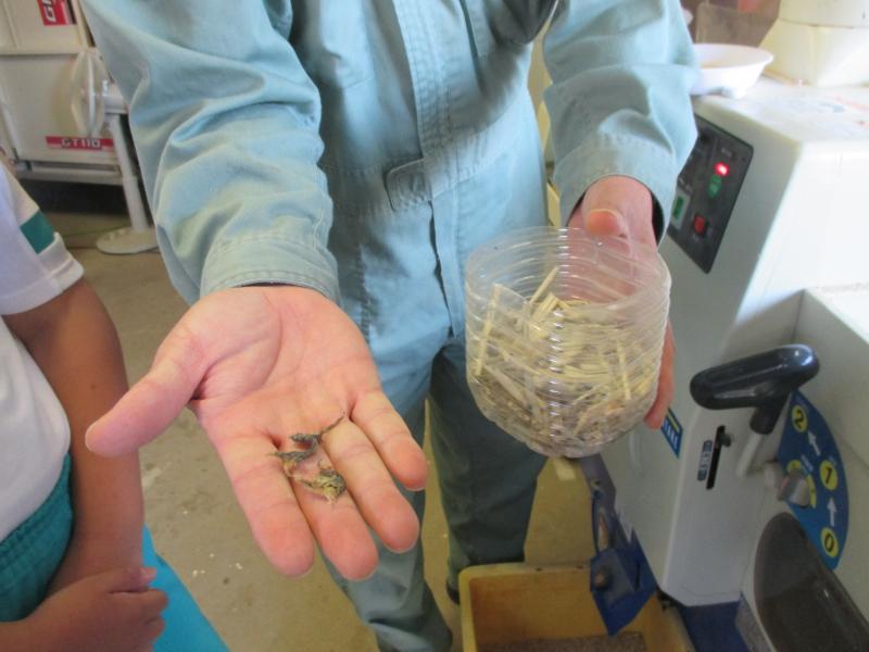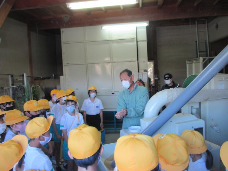 10月6日(火)に、いつも米作りについて教えてくださる小泉さんの作業場へ行き、もみすりの様子を見学しました。機械を間近で観察し、小泉さんの話を熱心に聞いてメモを取っていました。最後には学校田で獲れたお米を1人1袋いただき、嬉しそうな子供たちでした。