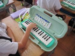 ↑ 1年生が,音楽で鍵盤ハーモニカを始めました。卵を持つような形の手を作り,鍵盤にのせています。