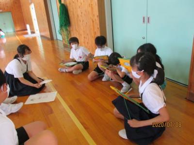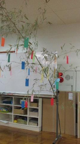 井上公民館館長の南さんからいただいた笹に,1年生が,願い事を書いた短冊と飾りを付けました。笹が賑やかになり,七夕らしくなってきました。時々願い事を読んでいる上級生の姿が見られ,ほほえましいです。