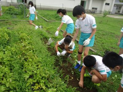 6年生の理科「植物のからだのはたらき」の学習に使うために育てたジャガイモを収穫しました。