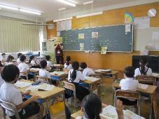 6年生の少人数授業(算数)です。人数が少ないため,自分の考えや思いを出しやすいようです。落ち着いて勉強していました。 こちらも6年生の少人数授業(算数)です。問題を解く際のポイントを丁寧に確かめています。懸命にノートを取っていました。 5年生の外国語科です。担任とALTが会話のデモンストレーションを行っています。この後,子供たちも対話を行いました。