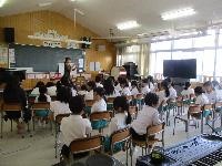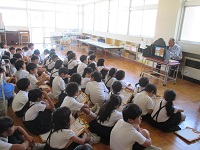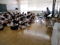 3年生以上が集まった音楽室では,絵本の読み聞かせの後,