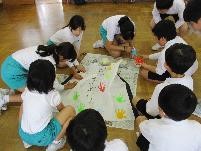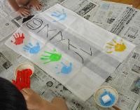 手形を押します。自分で塗料を塗る子もいれば,上級生や