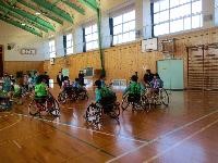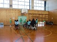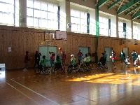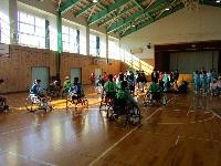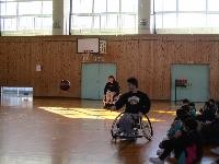 6年生の総合的な学習の時間「未来をデザインする~夢に向かって~」の学習で,車椅子バスケットボールの選手,岩崎大輔さんと半田幸司さんをお迎えしました。生活用の車椅子とバスケットボール用の車椅子の違いを教えていただいた後,早速車椅子をお借りしてバスケットボールを体験しました。シュート練習や鬼ごっこでウォーミングアップをし,チーム対抗のゲームをしました。子供たちは「習うより慣れろ」で,車椅子の操作も上手くなり真剣に試合をしていました。