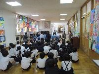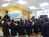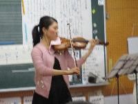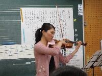 バイオリン奏者の横山友美さんをお迎えして鑑賞会を行いました。2限目は2年生と4年1組が,3限目は1年生と4年2組がバイオリンの音色を楽しみました。小さな楽器から大きな音や澄んだ音が流れ出し,子供たちは珍しそうに聴いていました。最後にはバイオリンとピアノの伴奏で今月の歌を歌いました。