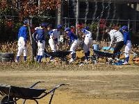 これまで十分使われてこなかった運動場西側の整備へのご協力をお願いしましたところ,午前中に練習をしていました井上ドラゴンズの子供たちも含め,約30名もの方が参加してくださいました。該当部分に砂を入れたり均したりしていただき,運動場をより広く使えるようになりました。本当にありがとうございます。