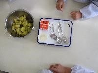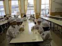 5限目,子供たちがランチルームに集合すると,サポーターの皆さんが茹で上がったサツマイモと,牛乳や砂糖,スプーンなどが載ったバットを持って来てくださいました。説明の後,子供たちはサツマイモを潰し牛乳などと混ぜ合わせ,ラップにくるんで茶巾絞りにしました。そして,皆で美味しくいただきました。