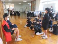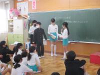 これまでお世話してくれた6年生への感謝の言葉、6年生から1~5年生へのメッセージの交流のあと、各班のはっぴを5年生へ渡しました。