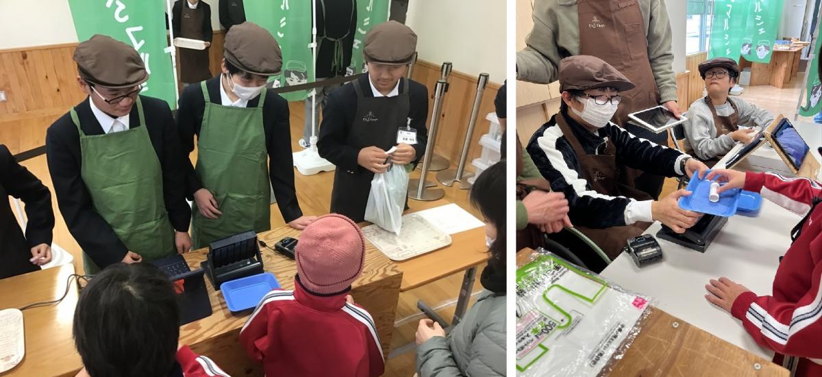 生徒が原画を描いた新品ののぼり旗がひらめく店内は店員とお客の児童生徒たちの笑顔で溢れ、大盛況でした。