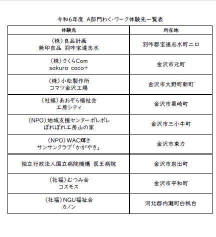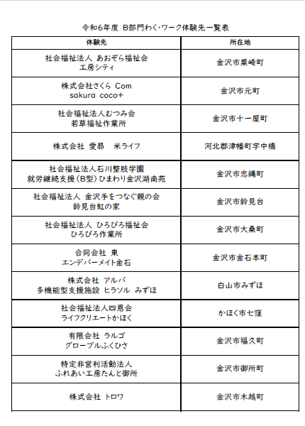 令和6年度AB中学部 わく・ワーク体験先一覧