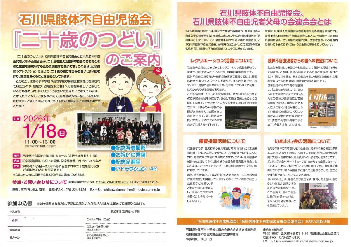 石川県肢体不自由児協会「二十歳のつどい」のご案内