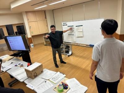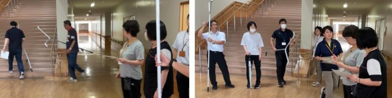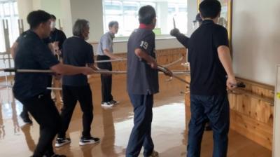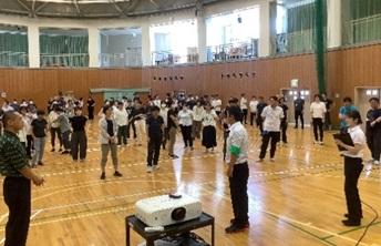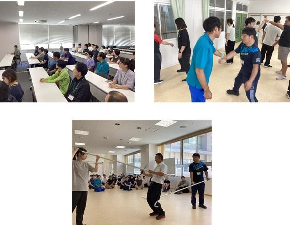 最初に学校内に侵入した不審者の動向について、最近の情報をお話していただきました。次に6月に行われた不審者対応避難訓練の振り返りとして、不審者に対応する職員の様子をおさめた動画をスクリーンに流しながら、留意することや改善点を説明していただきました。最後に、さすまたの使い方や護身術を教わり、職員全員がグループになり実戦形式で学習しました。
