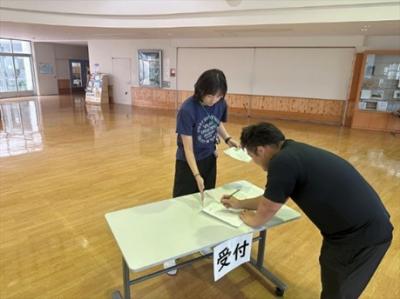係が大体育館の出入口に受付を設置し、引き渡しが始まりました。