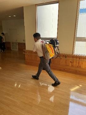 9月10日(火)に洪水発生時の避難訓練を行いました。 森下川が氾濫危険水位に達し、0.5~1m程度の浸水が発生したとの想定の下、1階の児童生徒に2階へ逃げる(垂直避難)よう避難放送されました。実際の動きを想定して各自準備している個人用災害備蓄品を持って避難し迅速に安全安心な避難体制を整えることができました。