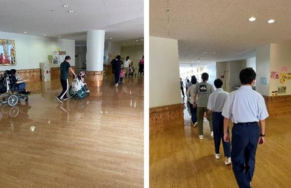 今回は暑さのためグラウンドへの二次避難は行わず、学部ごとの分散待機場所までの避難を行いました。実際の地震を想定し、怪我人を想定した人形をストレッチャーに乗せて運ぶ動きや、医療的ケアが必要な児童生徒が看護師のところへ移動する動き、防火扉が閉まっている状況で避難をする動き等を確認しました。
