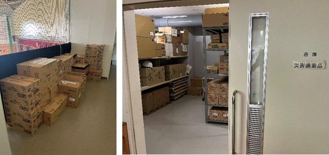 本校の災害用備蓄品です。大体育館の2階と、調理室前倉庫に保管されています。