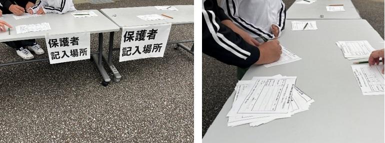 迎えに来た保護者は、引き渡し受付書に保護者名、生徒名など必要項目を記入。