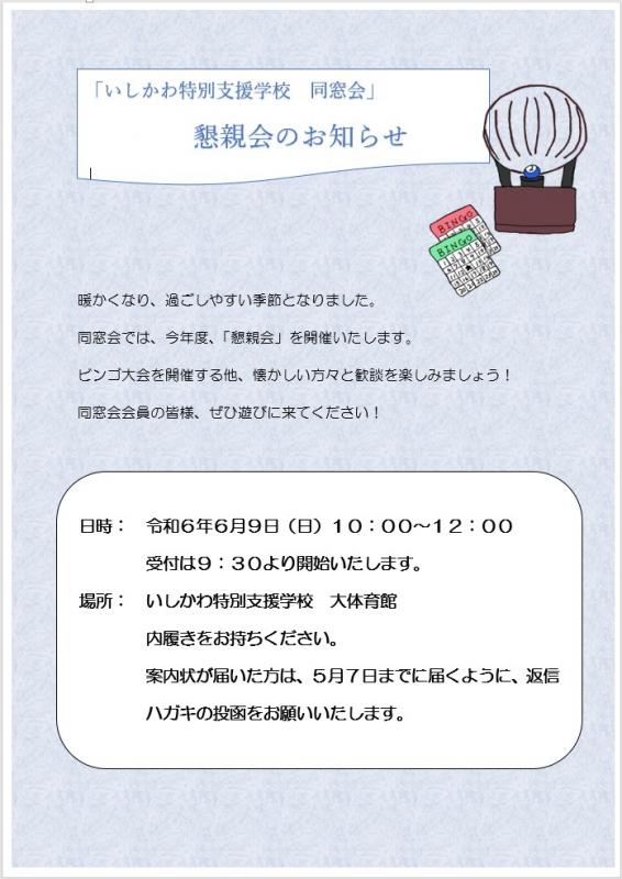 令和6年6月9日(日)に、本校体育館で「同窓会懇親会」を開催します。