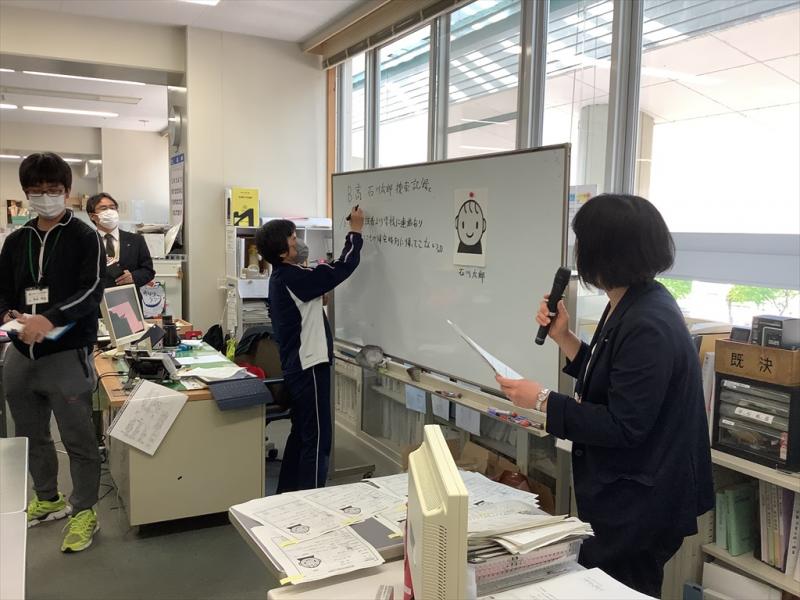 部主事から各学部ごとに割り当てられている捜索箇所を探すよう指示をしている場面です。数人でグループをつくって学校内外を捜索します。