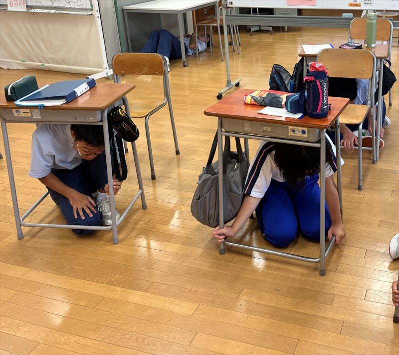 震度6強相当の地震を想定し、緊急対応の手順を確認しました。児童生徒は、地震発生のエリアメールと地震の音を放送で聞き、一次避難として教室の机の下へもぐったり、防災頭巾等で頭部を守ったりして、落ち着いて安全行動をとりました。