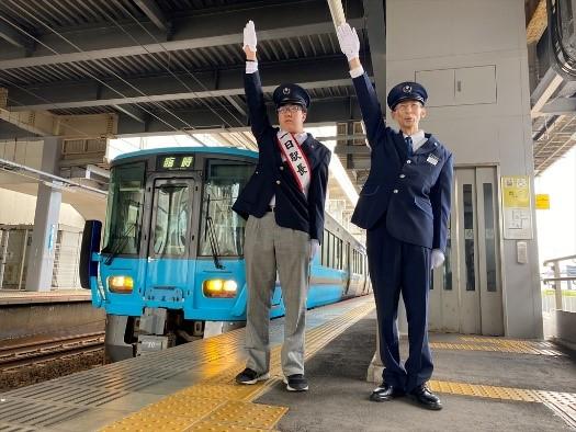2022年10月26日 13時51分10月15日にIR森本駅で鉄道イベントが行われ、B中3年の松田幸祐さんが1日駅長を体験しました。委嘱式の後、構内アナウンス、改札でのスタンプ押し、電車発車の合図などの体験で本職さながらに業務をこなし、意欲的に取り組む姿が見られました。鉄道好きな松田さんにとって、中学部生活の思い出に残る貴重な体験となりました。