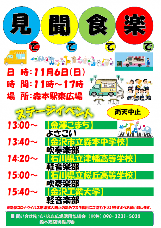 2022年11月2日 16時58分11月6日(日)11時~17時 森本駅東広場にて、「見て、聞いて、食べて、楽しんで」イベントが開催されます。