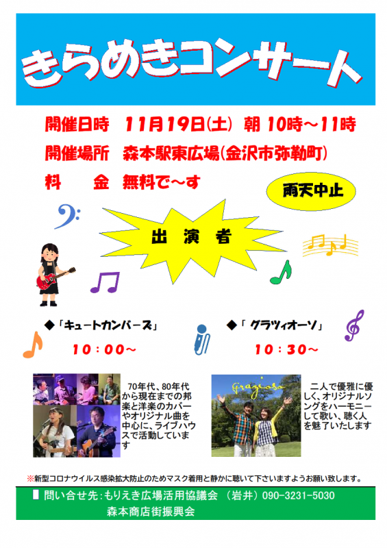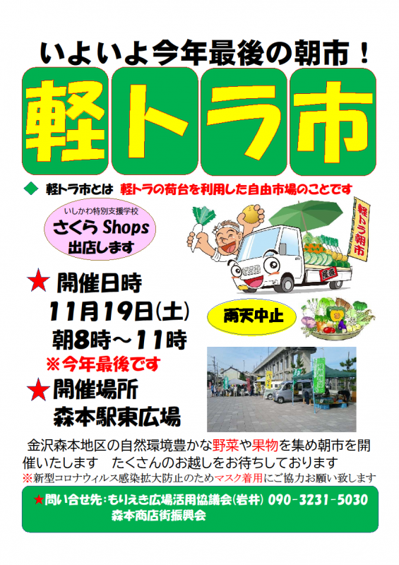 2022年11月18日 09時27分11月19日(土)8時から11時まで、森本駅前広場にて軽トラ市、きらめきコンサートが開催されます。
