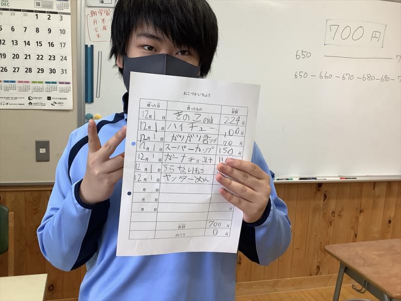 その日の値段設定の範囲におさまるよう、電卓を使って、どのお菓子カードを買えるか真剣に考えています。