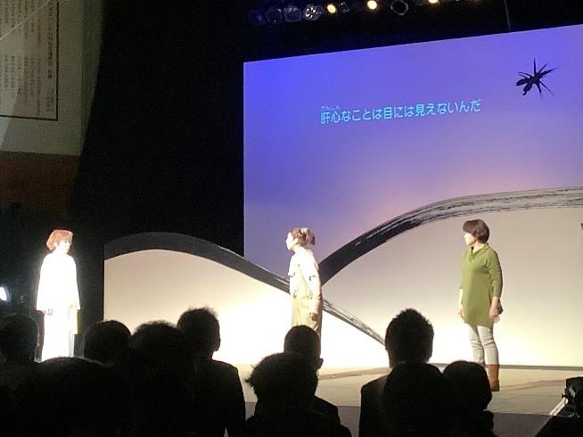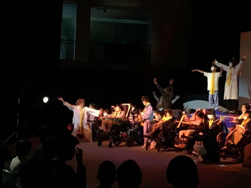 本物の空気感に圧倒されて「星の王子様」に見入っていた児童生徒達。中学部は一緒にステージに立つこともできました。俳優さんと一緒のステージに立てた児童生徒はキラキラ輝いていましたよ。また、東教頭先生は地理学者、黒坂先生は飲み助役で出演しました。