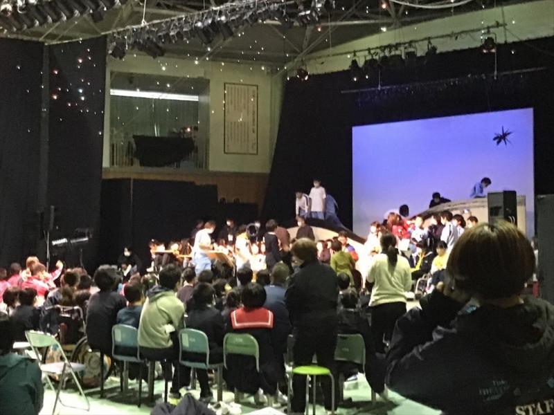 12月7日(水)にA小5,6年生、B小4,5,6年生、AB中学部が鑑賞しました。体育館が本物の劇場と様変わりしました。体育館の約半分がステージとなり大きなセットが組まれ、天井には照明器具がつるされ、まさに劇場そのものでした。車いすがステージに上がりやすくするためにスロープをも特注で作ってくださいました。