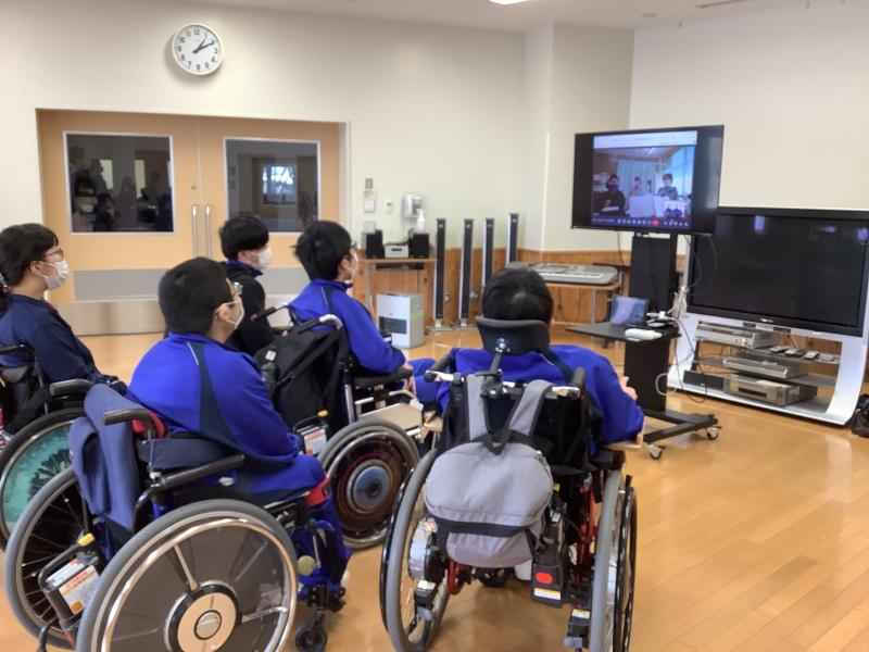 東京都立多摩桜の丘学園の生徒は、得意の英語で自己紹介をしたり、本校の生徒は、ボッチャ甲子園での優勝について話したりするなど、緊張しながらも少しずつ笑顔も見られる交流になりました。東京都立多摩桜の丘学園の生徒から「雪が降ったらどのように通学しますか?」と質問があったり、本校生徒からは「全校生徒は何人ですか」などの質問がありました。今回は、自己紹介程度の簡単な内容でしたが、3月2日に行われる2回目の交流会では、お互いが学習で取り組んでいる内容等を発表し合うことを予定しています。