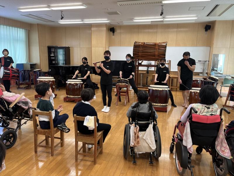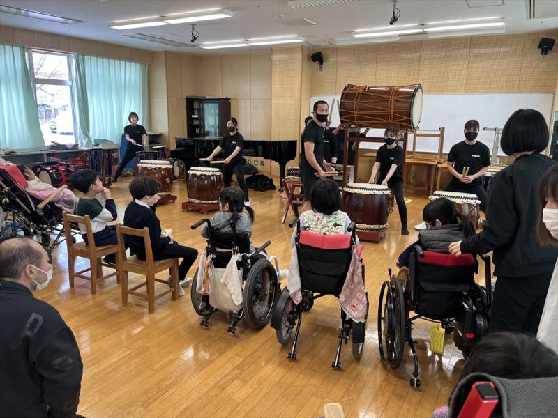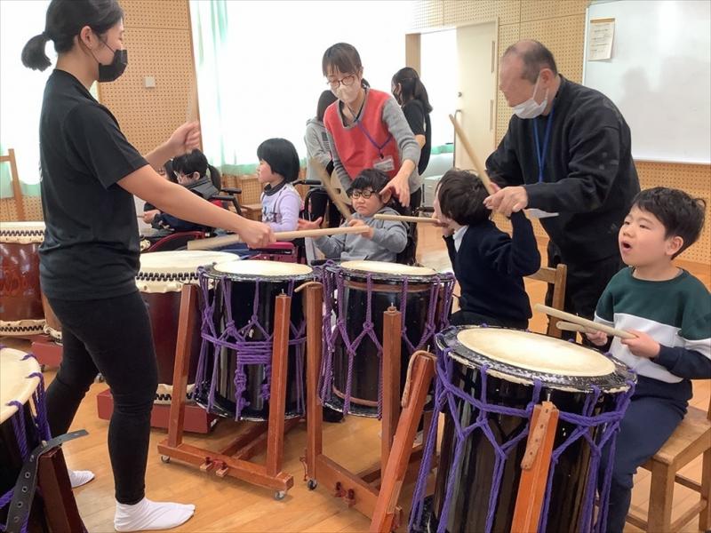 2023年3月2日 10時17分地域の伝統文化に根付いて活動されている和太鼓チーム(朝霞太鼓)の方々をお招きして、迫力ある演奏を聴いたり一緒に演奏したりしました。地域の方々とふれあえる、インクルーシブな活動ができました。