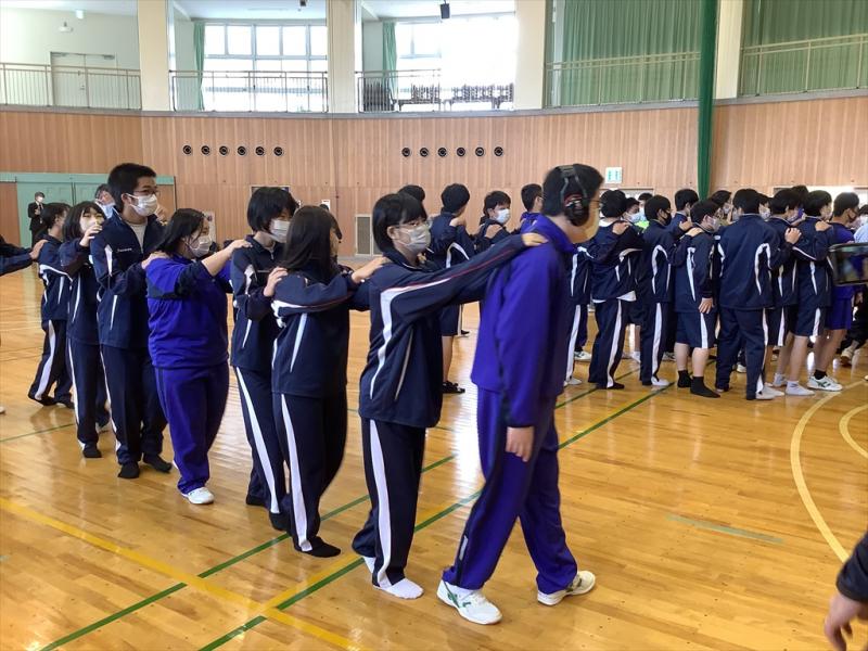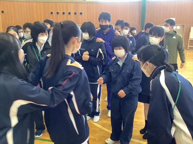 金沢向陽高校1年生が、遠足で本校に来て互いに挨拶してから、じゃんけん列車というゲームをしました。初めは緊張した表情が見られましたが、じゃんけんに勝って一緒に喜んだり、みんなで一列の列車になったりすることで、自然と笑顔に包まれた楽しい時間を過ごすことができました。