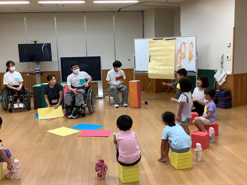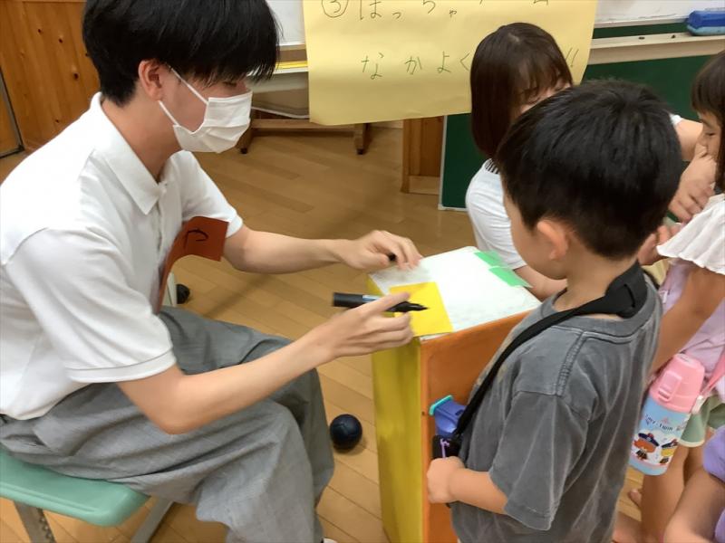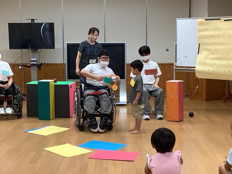 2023年8月1日 10時19分7月14日(金)の2限、A部門高等部の家庭科の授業で生徒3名(西村遥哉さん、坂口由宇さん、林咲希さん)が薬師谷保育園の年長児9名と本校で交流しました。
