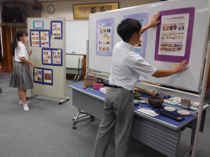 展示会場には金沢向陽高校の文化部の作品が展示されており、様々な作品を目にしながら、本校の活動を知ってもらおうと二人で協力し、学校紹介ポスターや生徒会活動紹介の掲示と作業製品の展示をしました。