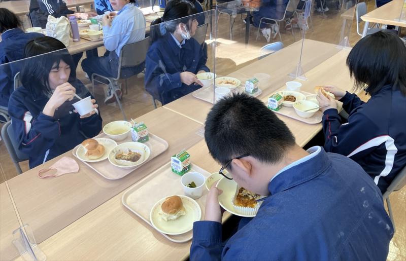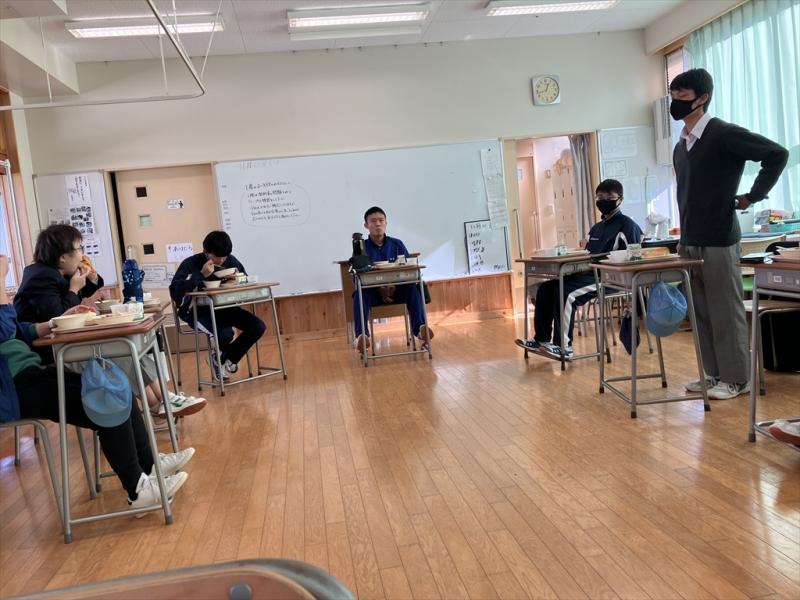 給食交流は食堂と1-1教室で行いました。食堂では時間が経つにつれて徐々に雰囲気に慣れ、両校生徒同士で会話をする様子が見られました。1-1教室では給食を食べながら自己紹介を行いました。それがアイスブレイクとなり、給食後には両校生徒が交わって楽しく会話するシーンも見られました。