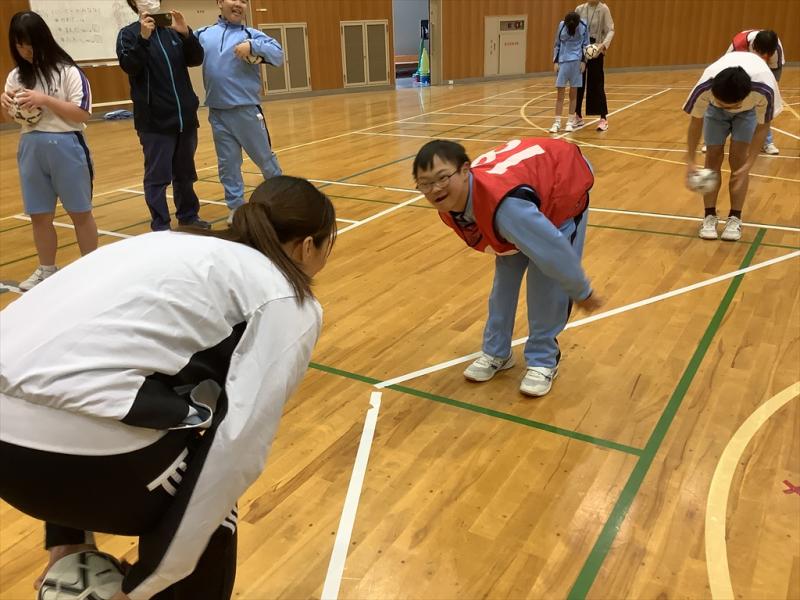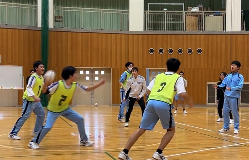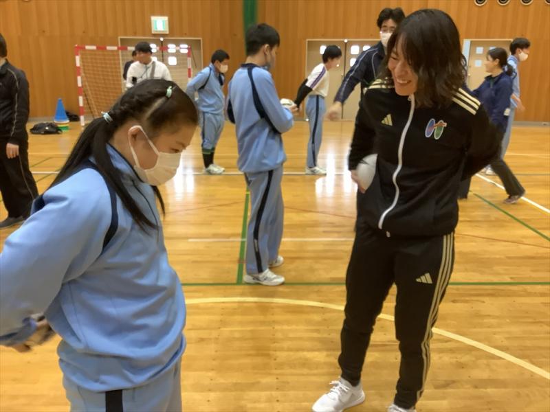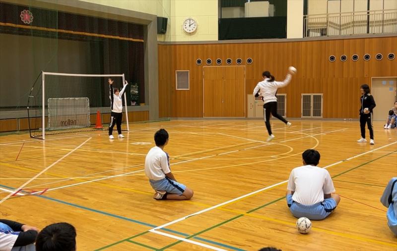 2023年12月22日 14時57分12月14日(木)に、北國銀行ハンドボール部Honey Bee(ハニービー)の選手のみなさんが来校し、B中2年生と一緒にハンドボールを楽しみました。ほとんどの生徒がハンドボールに触れることは初めてでしたが、ボールを利用した準備運動、シュート練習等を体験するうちにハンドボールをすることに夢中になっていました。最後に行った選手との簡単なゲームでは、ゲームに出た生徒も応援する生徒も大いに盛り上がりました。