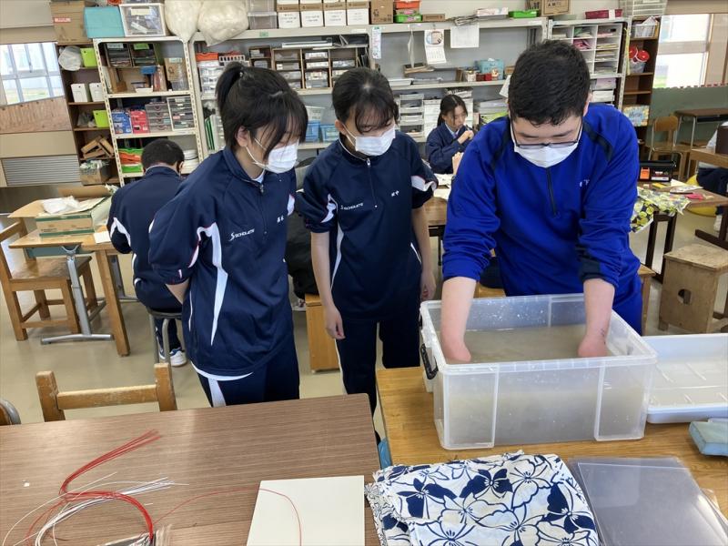 2023年12月26日 09時00分12月14日(火)に金沢向陽高校1年11H生徒が11月21日の12Hと同様に本校の生徒と共に作業学習をしました。最初はやはり緊張している様子でしたが徐々に緊張感もほぐれ、クラフト班ではクラフトバンドの長さを一緒に測ったり、紙工班では紙すきの工程を本校生徒が説明して向陽高校の生徒が体験したりするなど今回も両校の生徒が関わり合いながら作業を行うシーンが多く見られました。