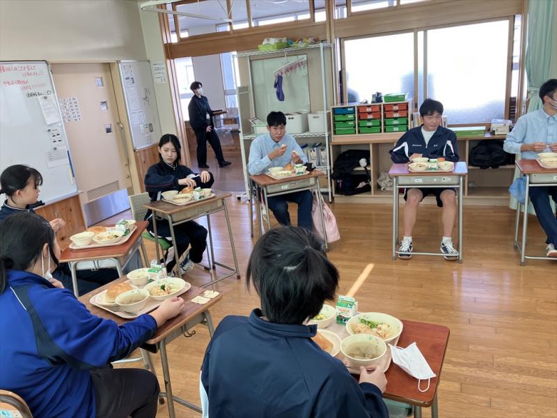 給食交流は食堂と1-1教室で行いました。食堂では時間が経つにつれて雰囲気に慣れ、両校生徒同士で会話をする場面も見られました。1-1教室では給食を食べながら自己紹介や「今一番欲しいもの」をテーマに話し合い、両校生徒が楽しく会話するシーンも見られました。