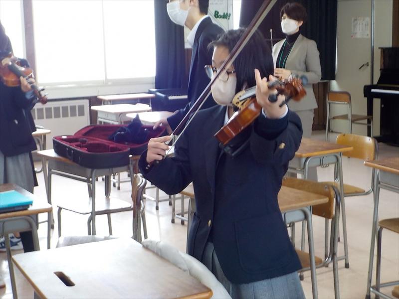 午後からは1年生の生徒4名が音楽の授業に参加し、バイオリンの演奏を体験してきました。向陽高校の生徒に演奏のポイント等を教えてもらいながら練習し、全員音を出すことができました。