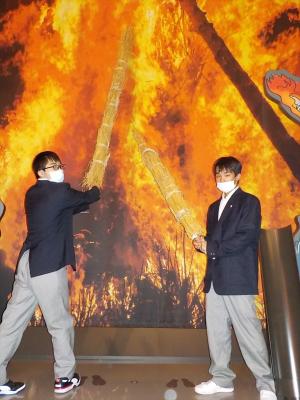 2日目は、和倉温泉お祭り会館で能登の祭りについて学習し、青柏祭の曳山体験をしました。のとじま水族館でイルカショーなどを見学し、ガラス工房ではアクセサリーやコースターを作りました。