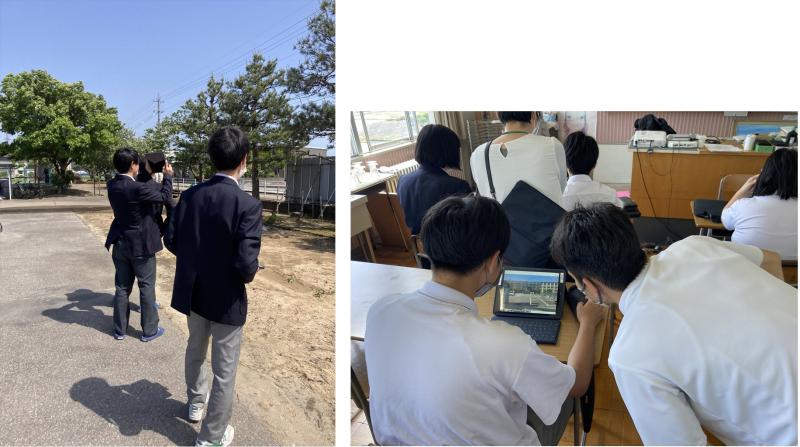 5月17日(金)向陽高校にて、産業技術コース2年生の生徒と金沢向陽高校の生徒が風景画を題材に美術で共同学習を行いました。2人~3人1グループで、金沢向陽高校の生徒がいしかわ特支の生徒に校地内を案内し、どの風景を撮影しようか相談しながら、遠近法で学んだことを基に、来年度から一緒に学ぶ金沢向陽高校の敷地の中で描きたい風景を撮影していました。次回の共同学習では、撮影した写真を基に描いた風景画の鑑賞会を行います。