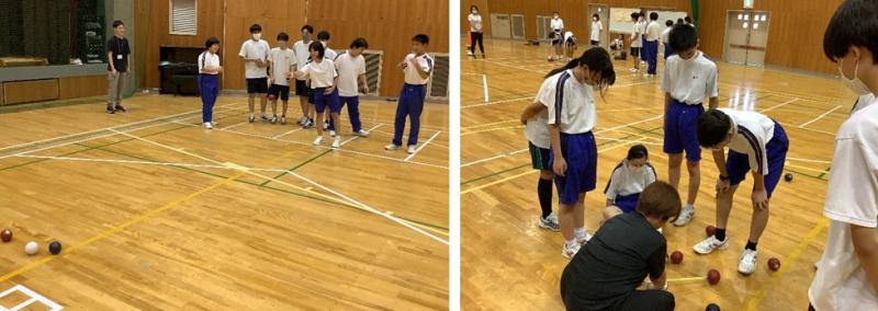 4~5人1組の両校の生徒で構成するチームを作り、まずは生徒それぞれが名前や好きのものなどを自己紹介で話した後、ゲームの展開を左右する投てき順を話し合いました。ゲームを進めていく中で、ジャックボールにピッタリ寄せるミラクルショットや相手のボールをはじく好プレーなどもたくさんあり、白熱したゲーム展開で盛り上がりました。チームメイトのプレーに一緒に喜んだり、ミスショットを励ましたりと、とてもいい雰囲気で合同学習1日目を終えることができました。