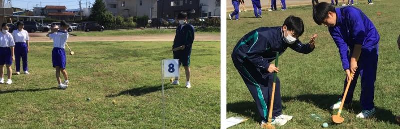 ゲームでは、自分たちで設定したホールをチームごとに回り、得点を競いました。ロングコースで飛距離のある良いショットが出た時や、ホールインワンをした生徒がいたときなどは大いに盛り上がり、ハイタッチしてみんなで喜びを分かち合いました。