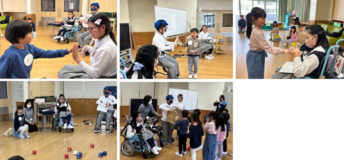 当日は、生徒たちが描いた絵に黒い紙を貼り、ペープサートにした道具で行うシルエットクイズと生徒たちが考えたボッチャゲームをしました。最後に、生徒からは手作りの金メダルを渡し、幼児の皆さんからは手作りのクリスマスリースと松ぼっくりのツリーをもらいました。