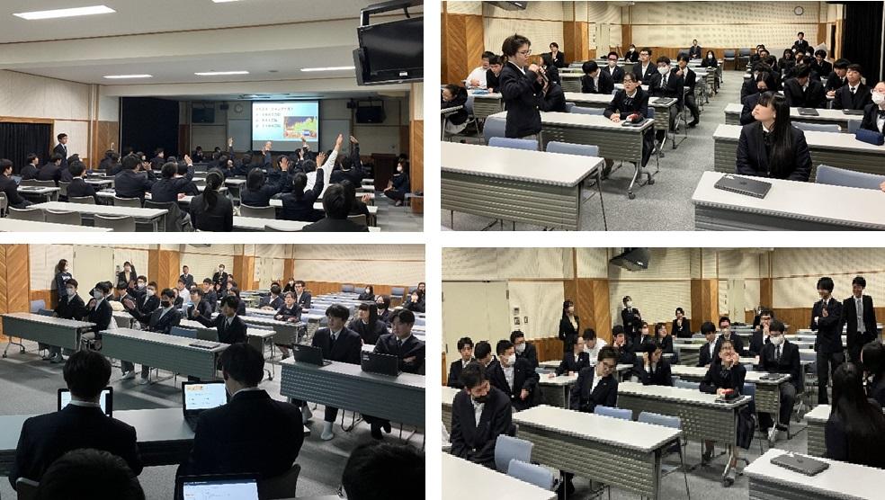 2024年12月25日 08時36分12月10日(火)に金沢向陽高校2年生徒と本校2年産業技術コース、学習グループAⅠ、AⅡの生徒で2回目の「総合的な探究の時間」の授業での交流を行いました。「魅力ある金沢を目指して」のテーマについて、今回は向陽高校2年生が「修学旅行で学んだ」ことから魅力ある金沢について考えたことを発表し、本校生徒はその発表を聞いてクイズに答えたり、質問したり、感想を言ったりしました。