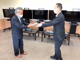 2021年10月1日 15時20分石川製作所様より、創業100周年の記念と、本校職員駐車場内にある石川製作所70周年記念モニュメントの管理へのお礼として、TV、TV台、ブルーレイ等5セットと、リモート集会などにも使えるビデオスイッチャーを寄贈していただきました。