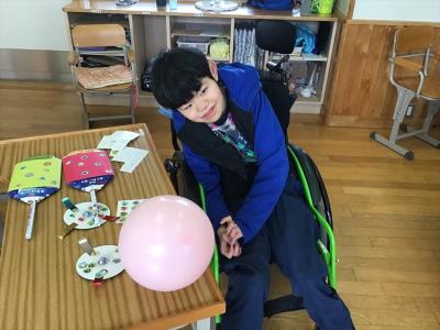 ↑羽子板は牛乳パック、羽根は風船を使いました