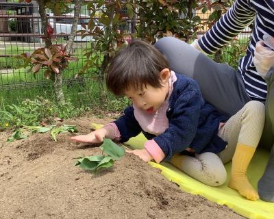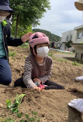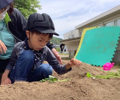2022年5月24日 18時00分畑に行って、なえや土にたくさん触れて、なえ植えをしました。